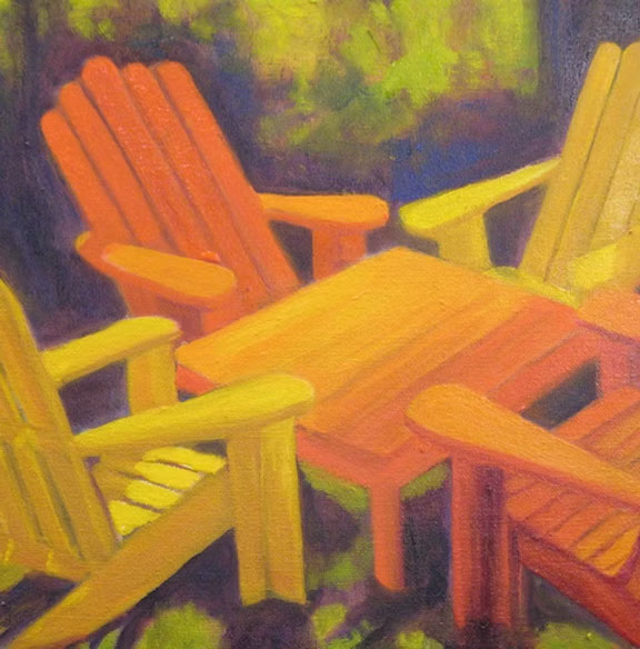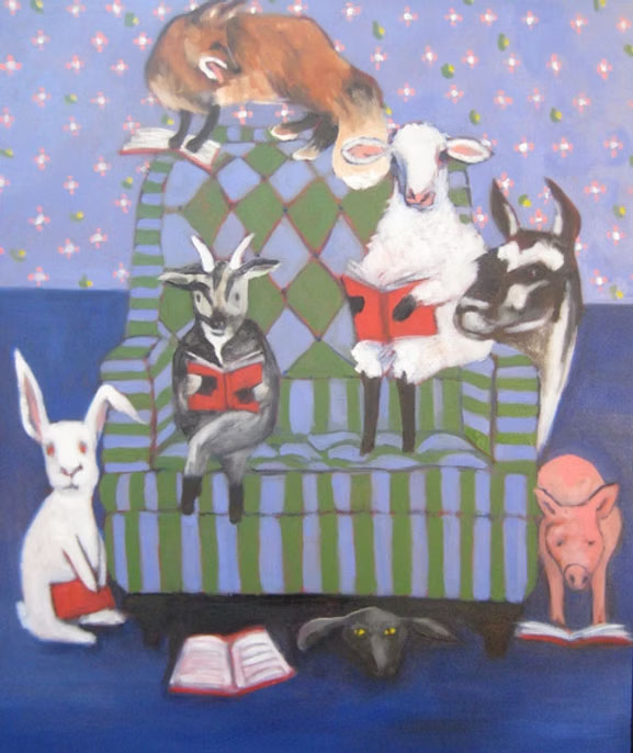 Sandra’s art reflects her love of animals, how much we can learn from them and their relationship to people plus her desire to make people laugh. “We human beings take ourselves too seriously,” she says. Her paintings are often stories or peaceful landscapes done with oil on canvas in her studio, mostly from photographs, often from garage sale photo books. She also create whimsical notecards with watercolor and has sold over 15,000. “I do art because it’s soulful. It helps me realize that the world is more than this crazy, warmongering mess that we’re in.”