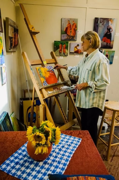 For as long as she remembers she was drawing and sketching what she saw, and she still paints and draws at her peaceful two story studio tucked away in the Guerneville woods. When she was in high school near San Diego, she designed a winning house in a drawing contest which was actually built. After graduating from Berkeley, she became a French teacher for fourteen years. France is still one of her favorite subjects to paint.