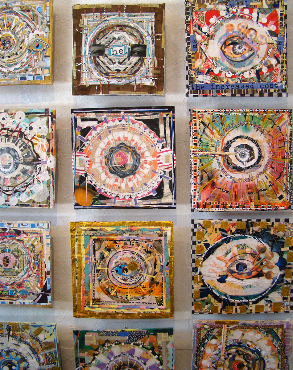 Douglas’s subject matter is varied: abstracts, flowers, mandalas, tapestries, waves, Plein Air landscapes, robots, many with a recurring circle theme. His work is both timeless and timely. He worked on over 100 pieces of “Eyes” and self-portraits during the pandemic. This series he calls “Covid Eyes” explores how wearing masks changed the way we look at people and how the eyes became more important to how we see people. The collages contain many layers, both figuratively and literally. They might reflect how he feels on a given day or come about spontaneously during his meditations.