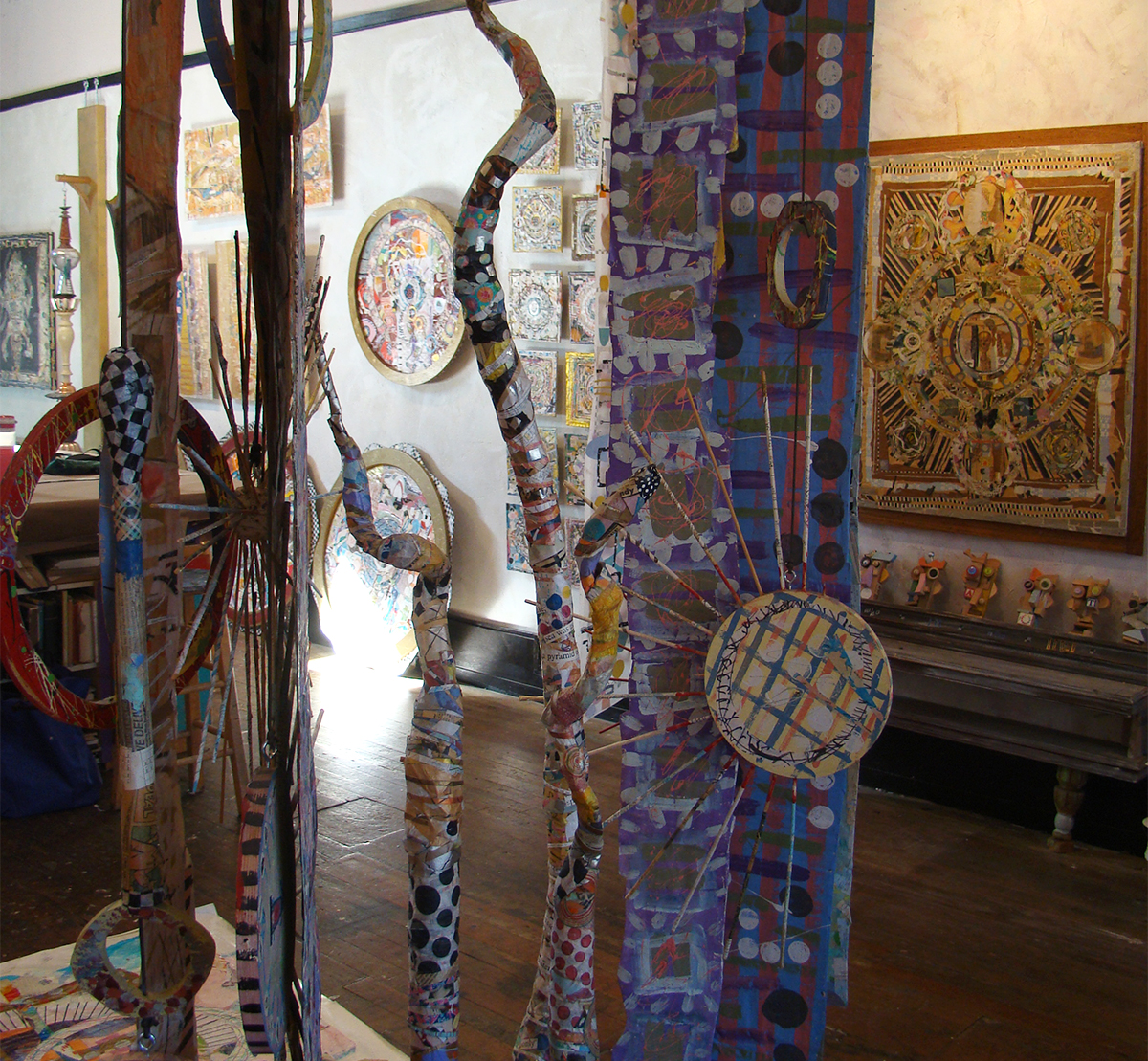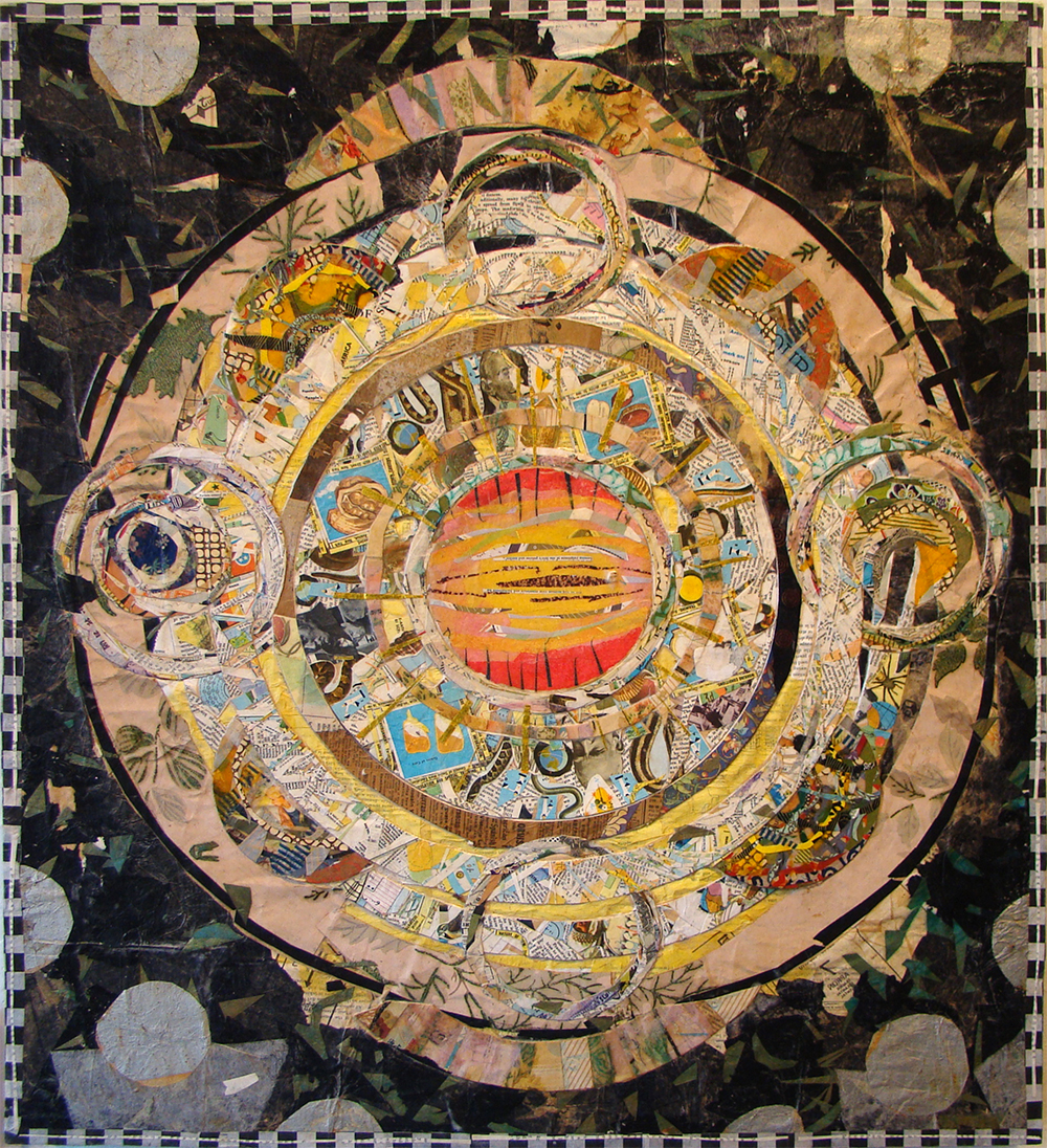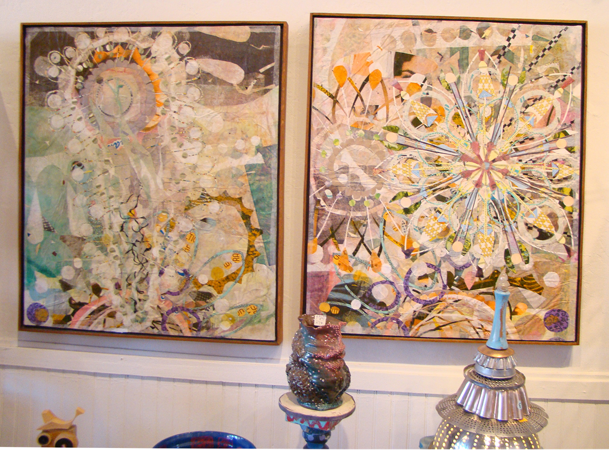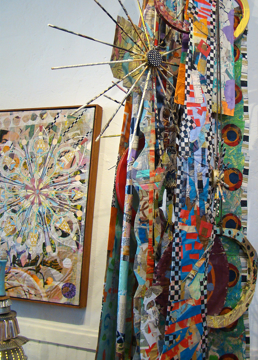 Douglas’s background in design and studies in Asia are evident in his work. His paper collages are highly detailed, multi-layered, and yet accessible. He describes his work as “painting with paper”. He is engaging and freely talks of his work and draws you into his world. He talks of “flow” and energy and not thinking and letting things happen around him. Douglas believes that the analytical mind is disruptive to creativity and causes blockages. He is very prolific doing not only extensive collages, making his own frames out of salvaged wood but also creating many 2 and 3 dimensional sculptures out of paper, ceramics, wood and other found objects.