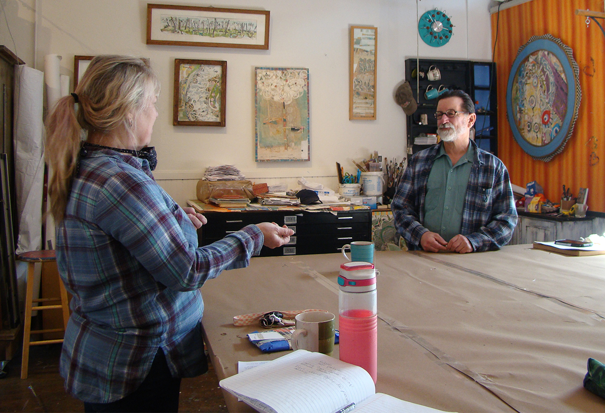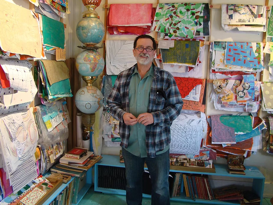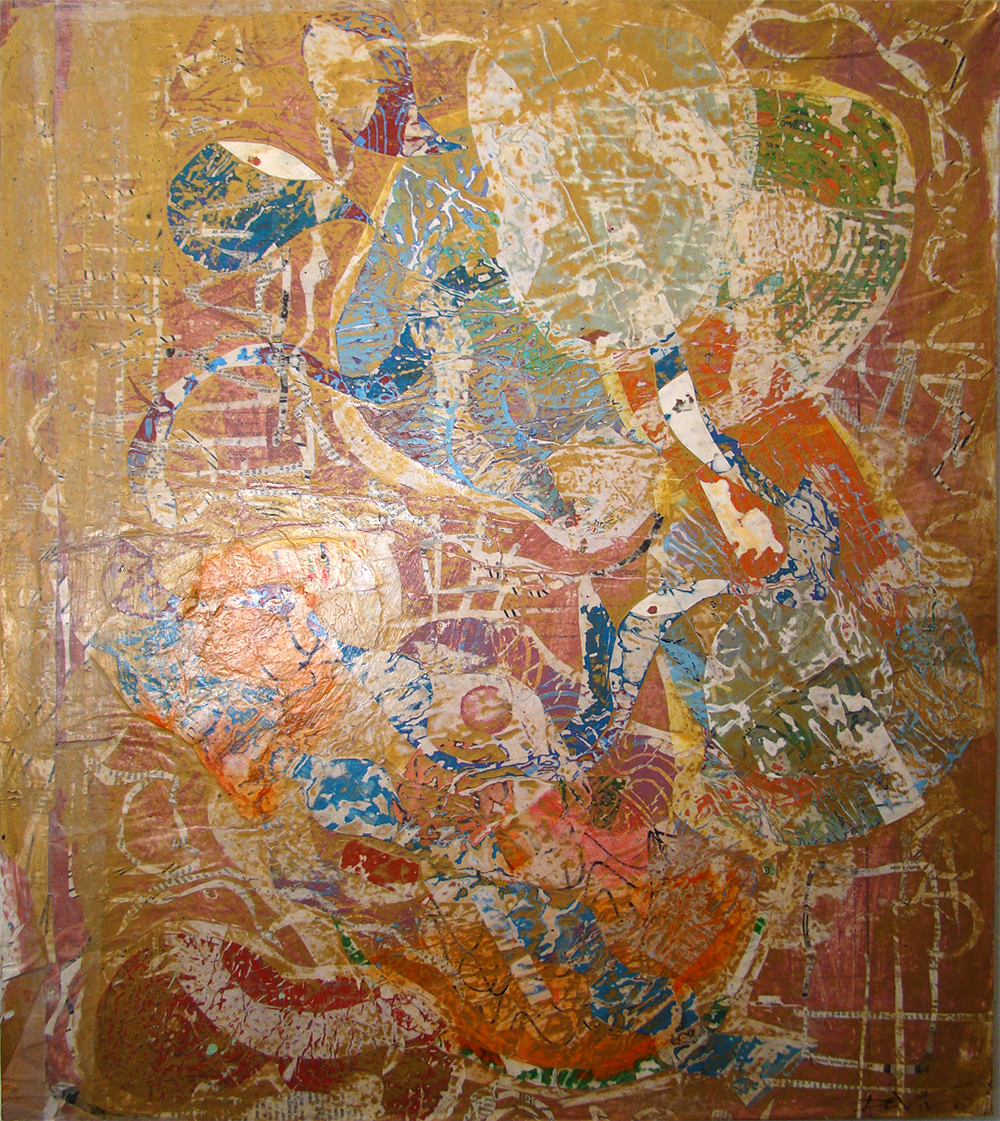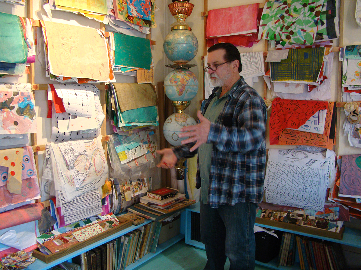 He often works on a hundred pieces at a time and frequently cuts up to half of his collages to make new and ever evolving pieces. He has a “paper room”, which is very interesting in itself. He makes or designs 12+ patterns on paper, which are used in his works. He believes that all people bring their energy into the room which changes the energy in the papers, which affects the collages he creates with them. The collages are pressed using wax paper and up to 400 lb weights for as long as 5 1⁄2 months. This “hidden magic” causes the papers to bleed together, change colors and bring new and unexpected effects. The entire process is fascinating.